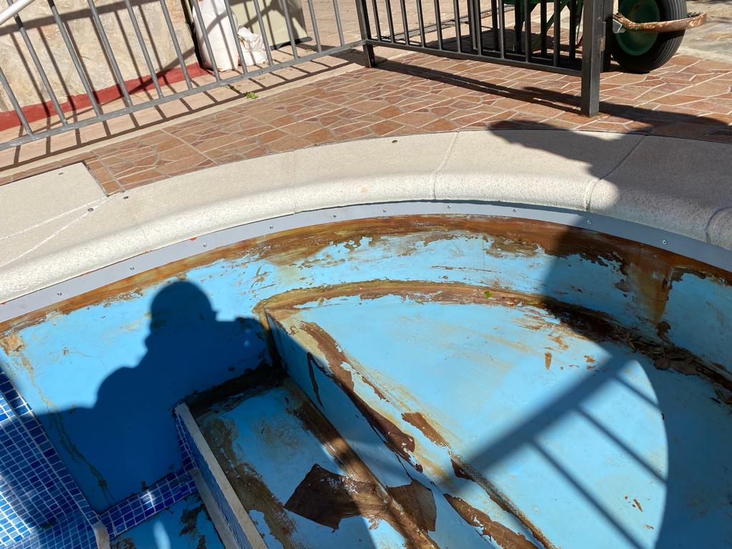 - LA LÁMINA DE LA ESCALERA ESTA TOTALMENTE RETIRADA POR OTRA EMPRESA NO CERTIFICADA QUE INTENTO SOLDAR SOLO LA LAMINA DE LA ESCALERA AL RESTO DE LA PISCINA Y NO PUDO PUESTO QUE ESO ES IMPOSIBLE TAMBIEN VEMOS QUE UTILIZO COLAMINADO DE MUY BAJA CALIDAD NO APTO PARA PISCINAS PARA INTENTAR HACER ESTA ACTUACION (ES LA CHAPITA GRIS QUE ESTA REMACHADA JUSTO DEBAJO DE LA PIEDRA DE CORONACION.