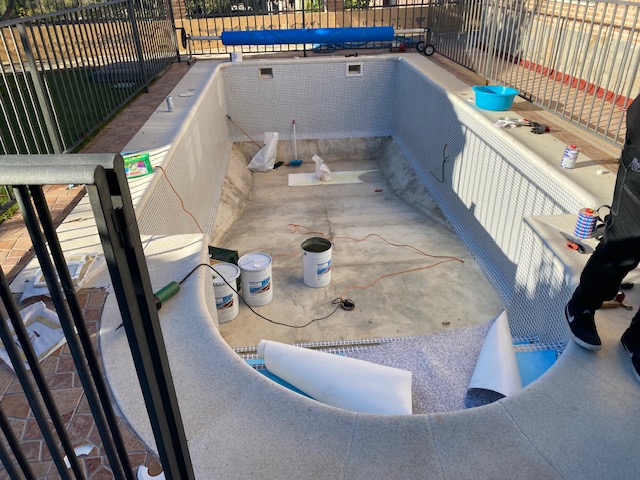 - PROCEDEMOS A LA INSTALACION DE LOS `PELDAÑOS CON LAMINA ANTIDESLIZANTE (EN ESTE CASO EL CLIENTE NOS SOLICITA QUE USEMOS LAMINA TOUCH ORIGIN 2MM PARA CREAR UN CONTRASTE CON EL RESTO DE LA PISCINA Y PODER DIFERENCIAR VISUALMENTE LOS ESCALINES CUANDO ESTE LLENA DE AGUA). FOTO DUANTE (3).